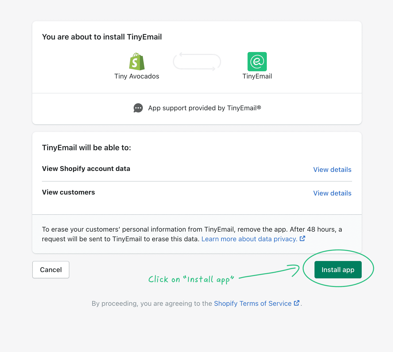 Once you see the confirmation prompt, click Install app. You will be asked to confirm tinyEmail's request to access your account and customer data. That is needed to populate your new account with subscribers and your business information.