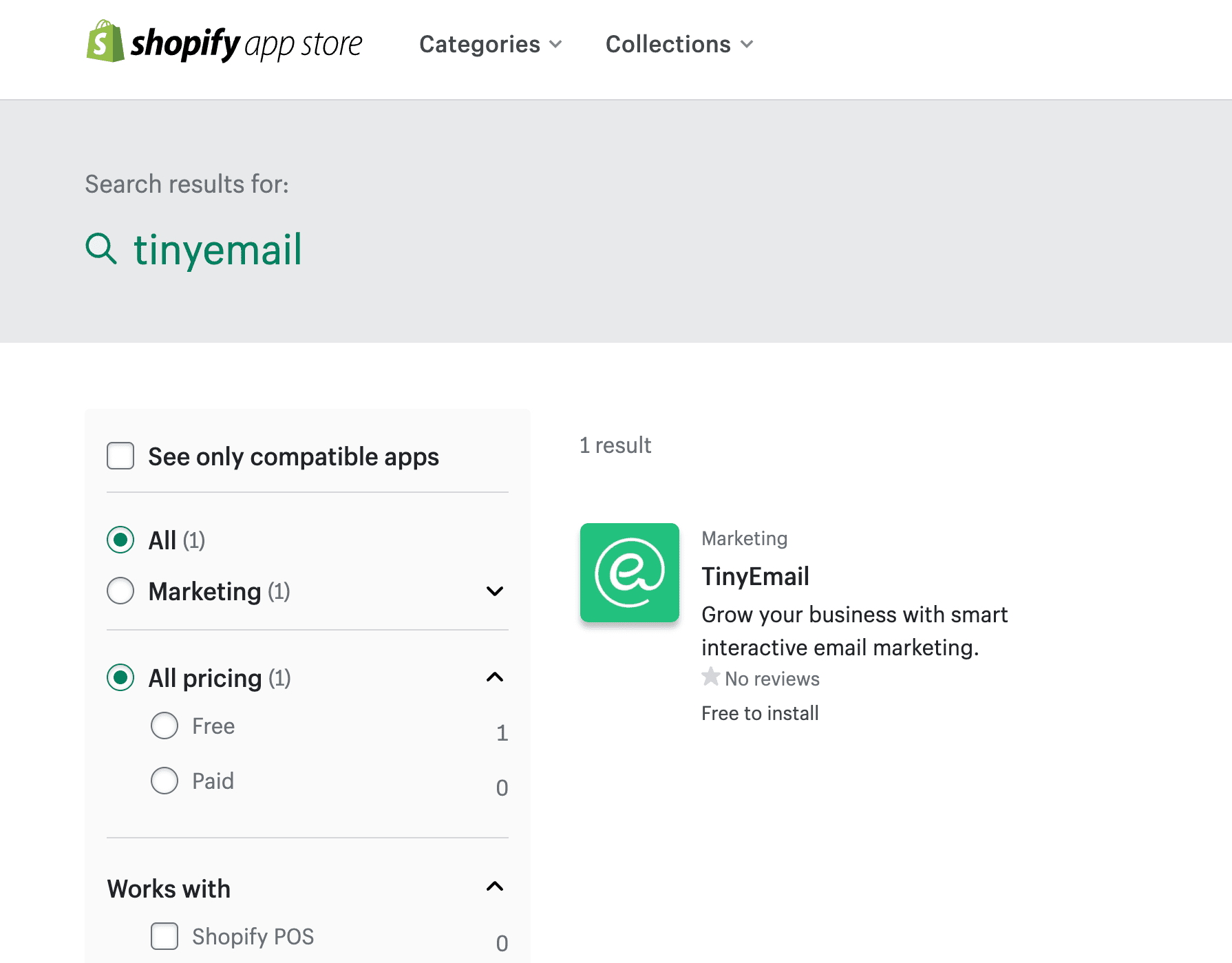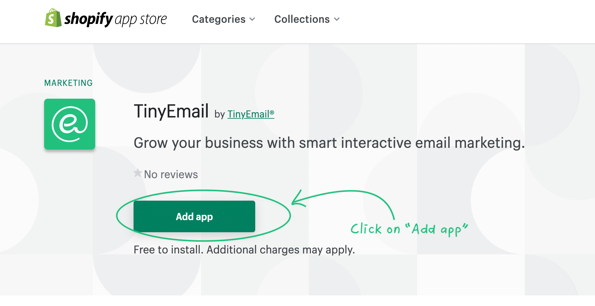Alternatively, head over to the Shopify app store and search for tinyEmail. Next, click Add app to install tinyEmail.