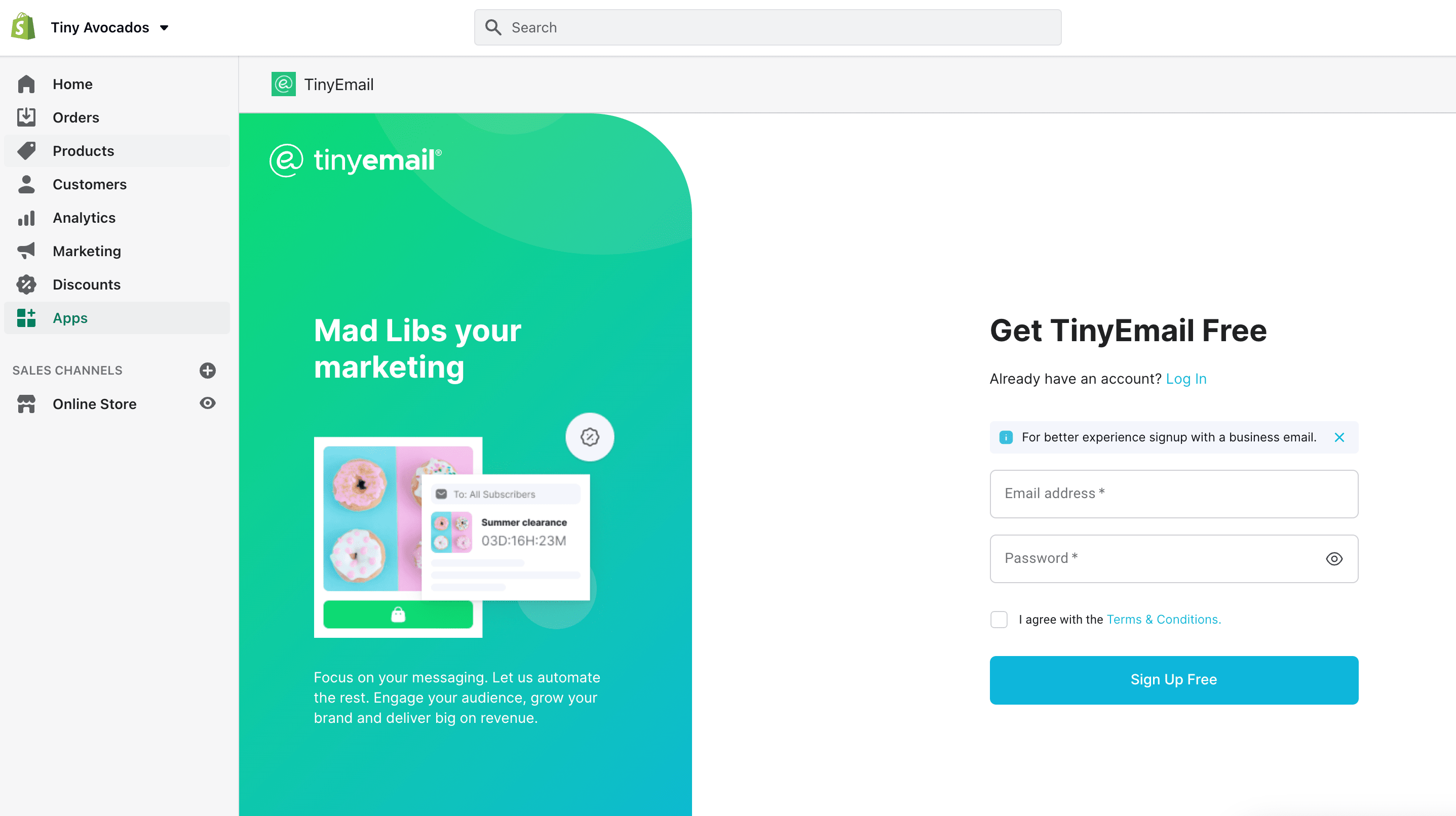 After installing, click the tinyEmail app. If you do not have a tinyEmail account yet, sign up for one. Alternatively, log in to your account through the app window inside Shopify.