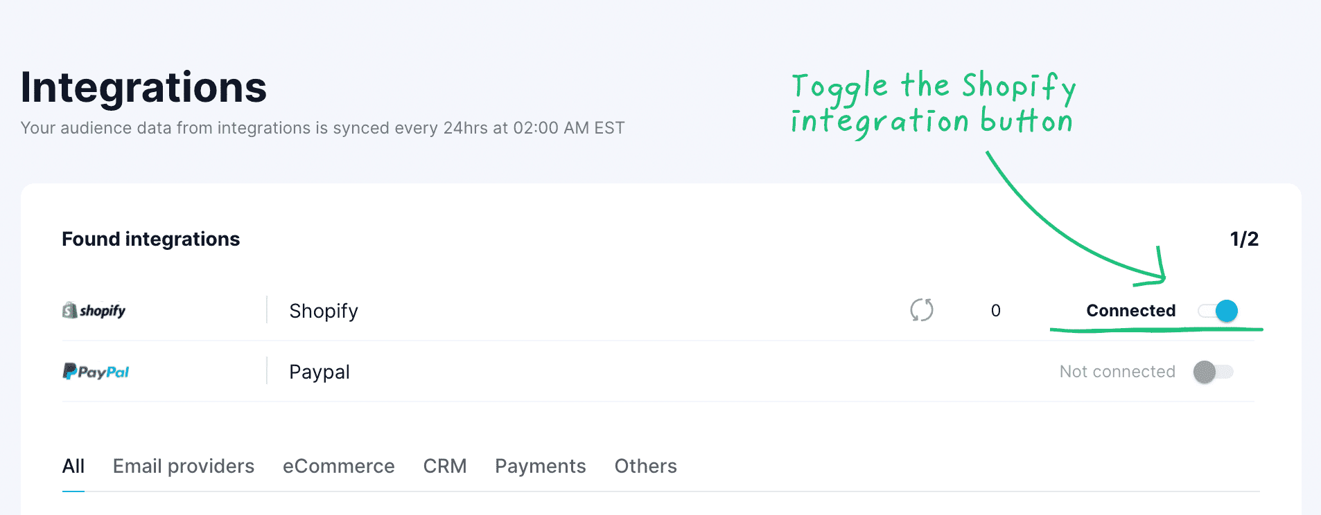 All your customer data and contact information gets synced automatically. You can also click on the refresh icon beside the connect switch to manually pull in data.