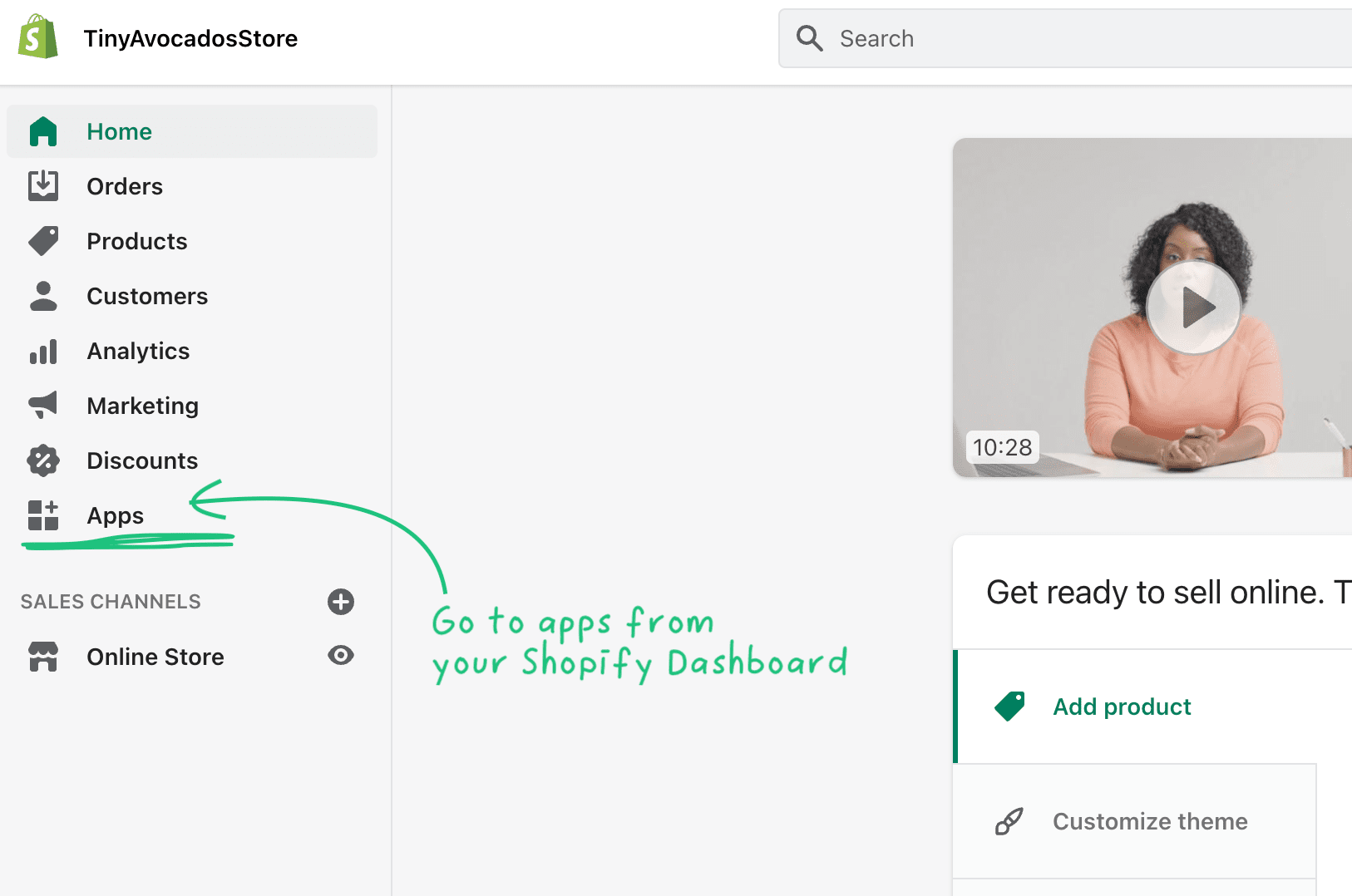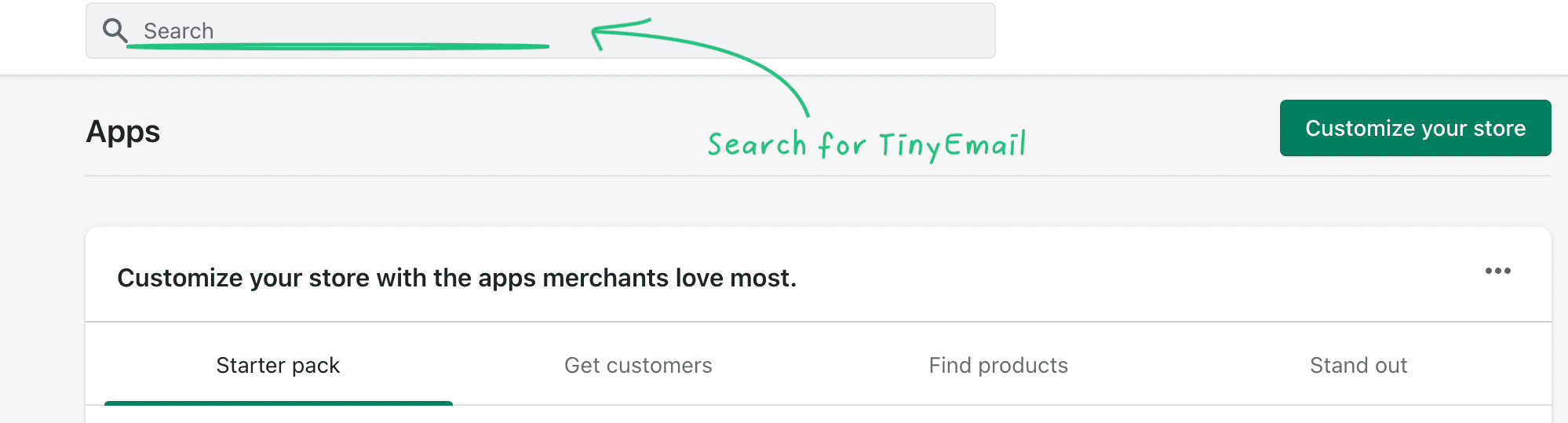 Log in to your Shopify store and navigate your way to the apps section from the dashboard. From here, search for tinyEmail in the search bar.