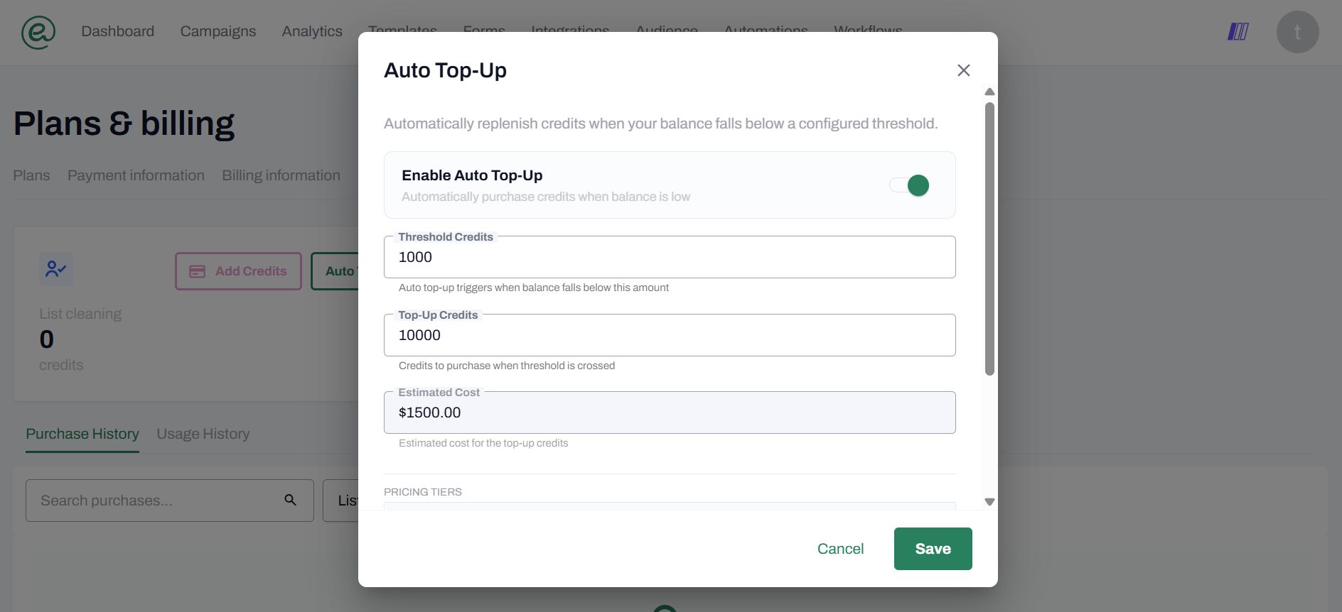 - Set the Top-Up Amount: Enter the number of credits (e.g., 10,000 credits) to be automatically purchased when the threshold is reached.