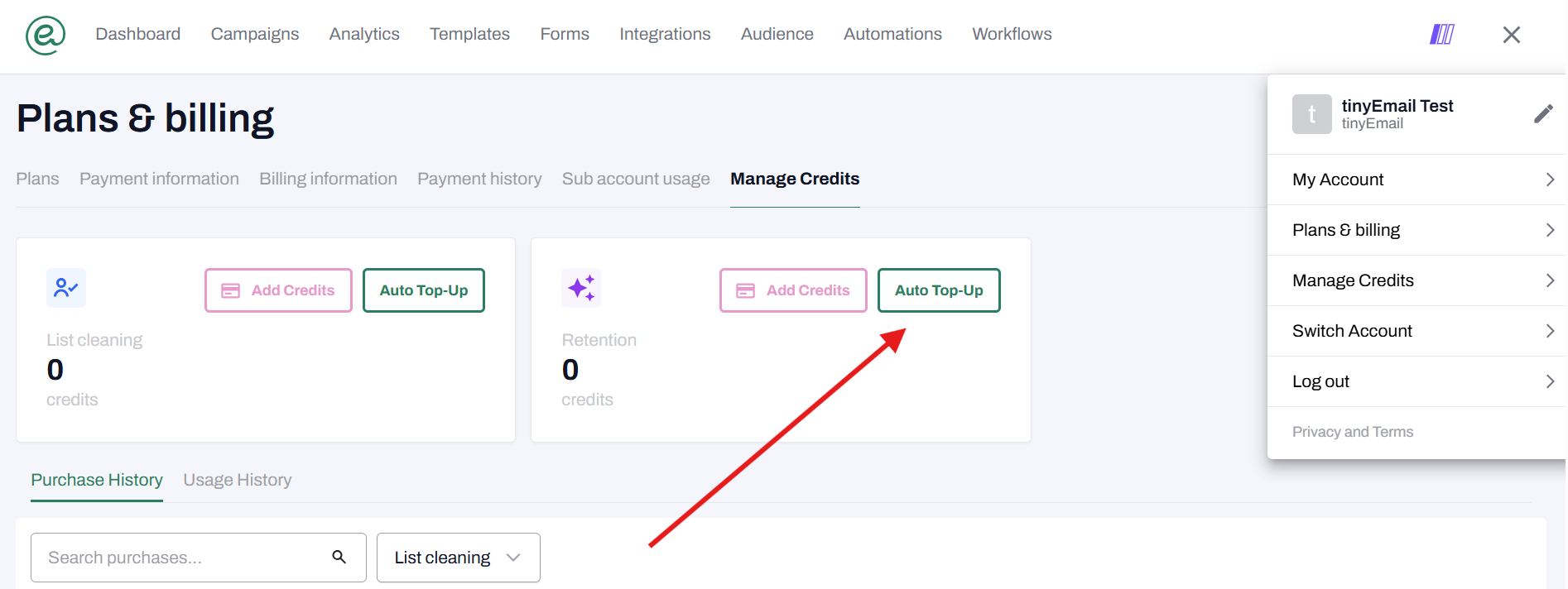 Regardless of your Auto Top-Up settings, you can still purchase credits manually at any time by clicking the Add Credits button.