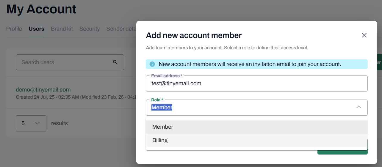 Enter the email address you want to invite and select the appropriate Role (Member or Billing).