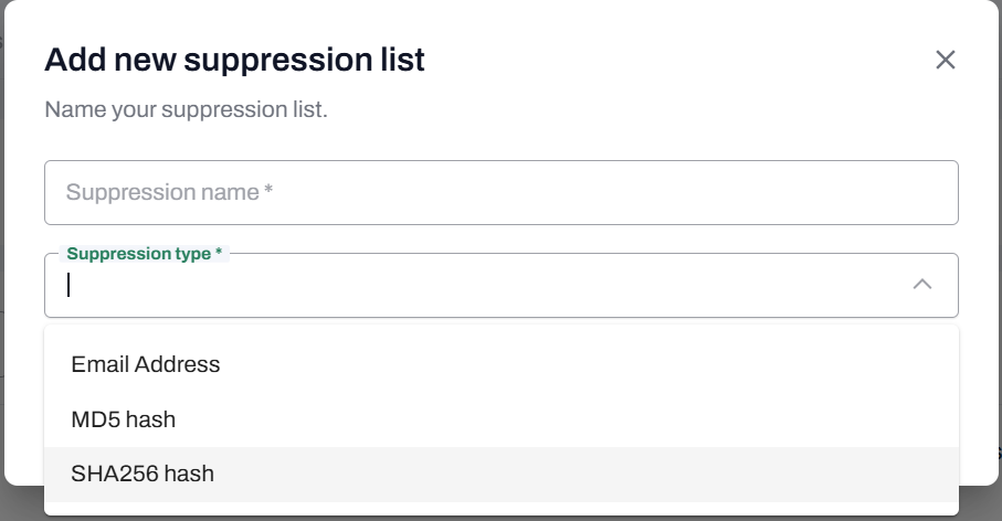 - Suppression Type: Choose the required type from the dropdown menu (Email address, MD5 Hash, SHA256 Hash).